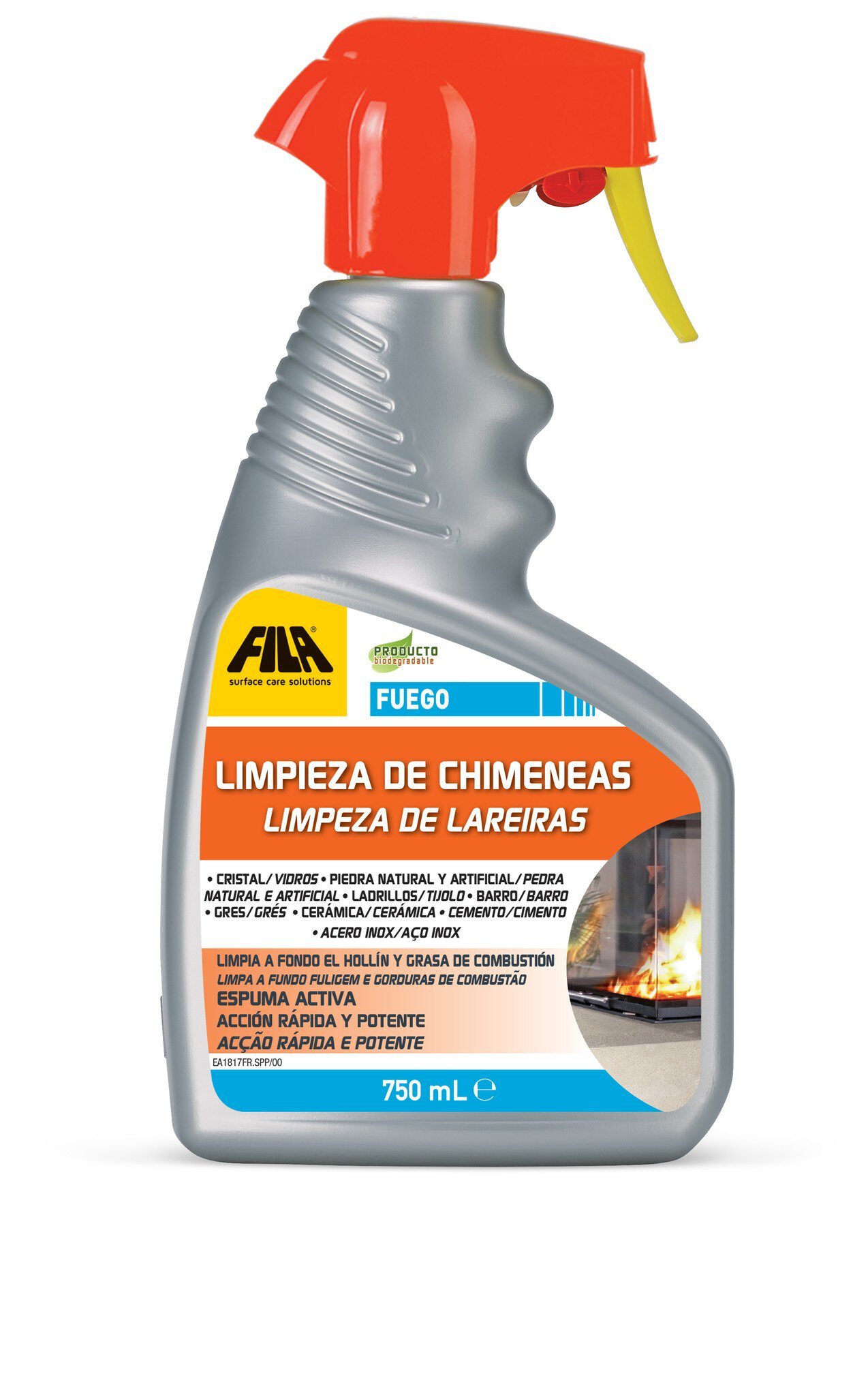 Detergent espuma en spray elimina hollín. Específico para la limpieza de cristales y revestimientos de estufas y chimeneas. Elimina eficazmente la suciedad intensa de grasa de combustión también en hornos, parrillas, revestimientos de chimeneas y barbacoas en ladrillo, piedra y cemento.