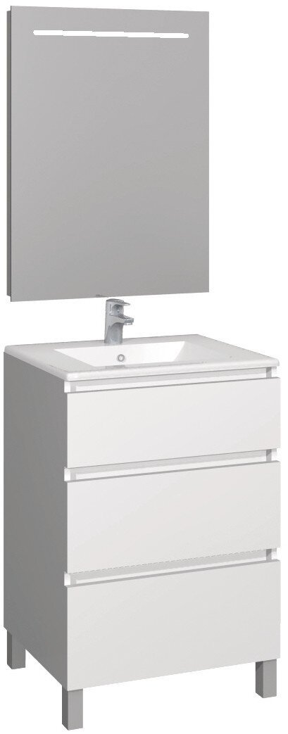 Conjunto formado por el mueble de baño a suelo MANNING de 60x46cm en color blanco mate, lavabo CODIGO II de 60cm y espejo led SHINE.