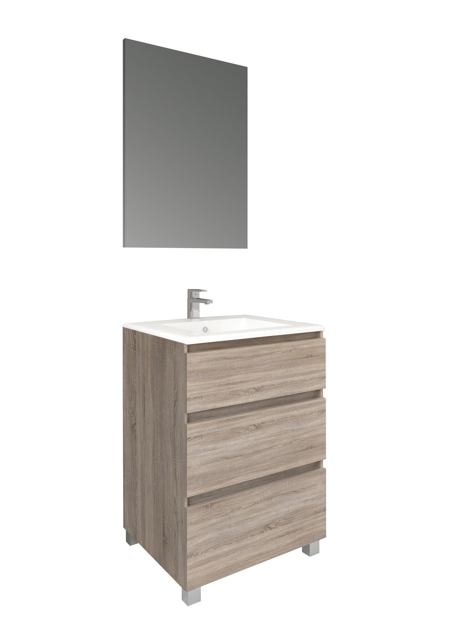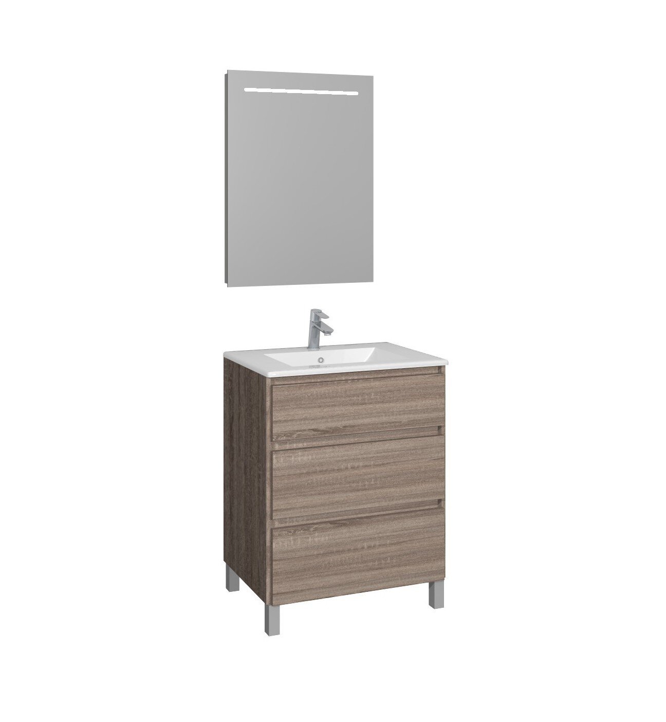 Conjunto formado por un mueble a suelo MANNING de 70 cm en acabado roble cambrián. Lavabo CÓDIGO II de 70 cm y espejo rectangular con luz frontal SHINE de 60×80 cm.