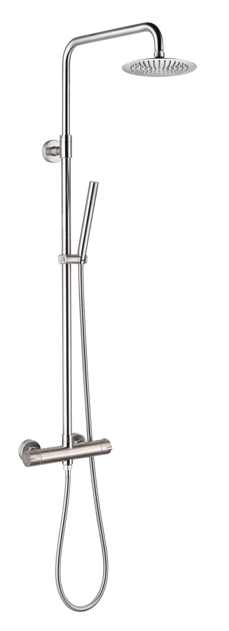 El equipo de ducha de la serie ACERO de Baho está fabricado en acero inoxidable 304 de la mejor calidad y su rociador efecto lluvia y su teleducha no incluyen baños de otros materiales, lo que contribuye a la durabilidad del equipo y también a la mejoría en la calidad del agua que dispensa, pues se evita que ésta contenga residuos de plomo y otros materiales tóxicos. Además, su acabado mate y exclusivo diseño le darán ese aspecto contemporáneo y distintivo que hará destacar tu baño aportándole elegancia. Gracias a su termostato, que permite prefijar los grados, evitarás el derroche de agua mientras ajustas la temperatura deseada, por lo que este conjunto además también contribuye a tu ahorro y al medioambiente. Tiene una altura total regulable de 90 a 135 cm, para que puedas instalarlo como mejor encaje con las características de tu ducha. Se instala a pared por 3 puntos, los 2 paralelos del grifo y el superior, que sostiene el codo telescópico del rociador. El derivador está integrado en el cuerpo del grifo, lo que contribuye a su estética y a la comodidad de uso y facilidad limpieza de la grifería.