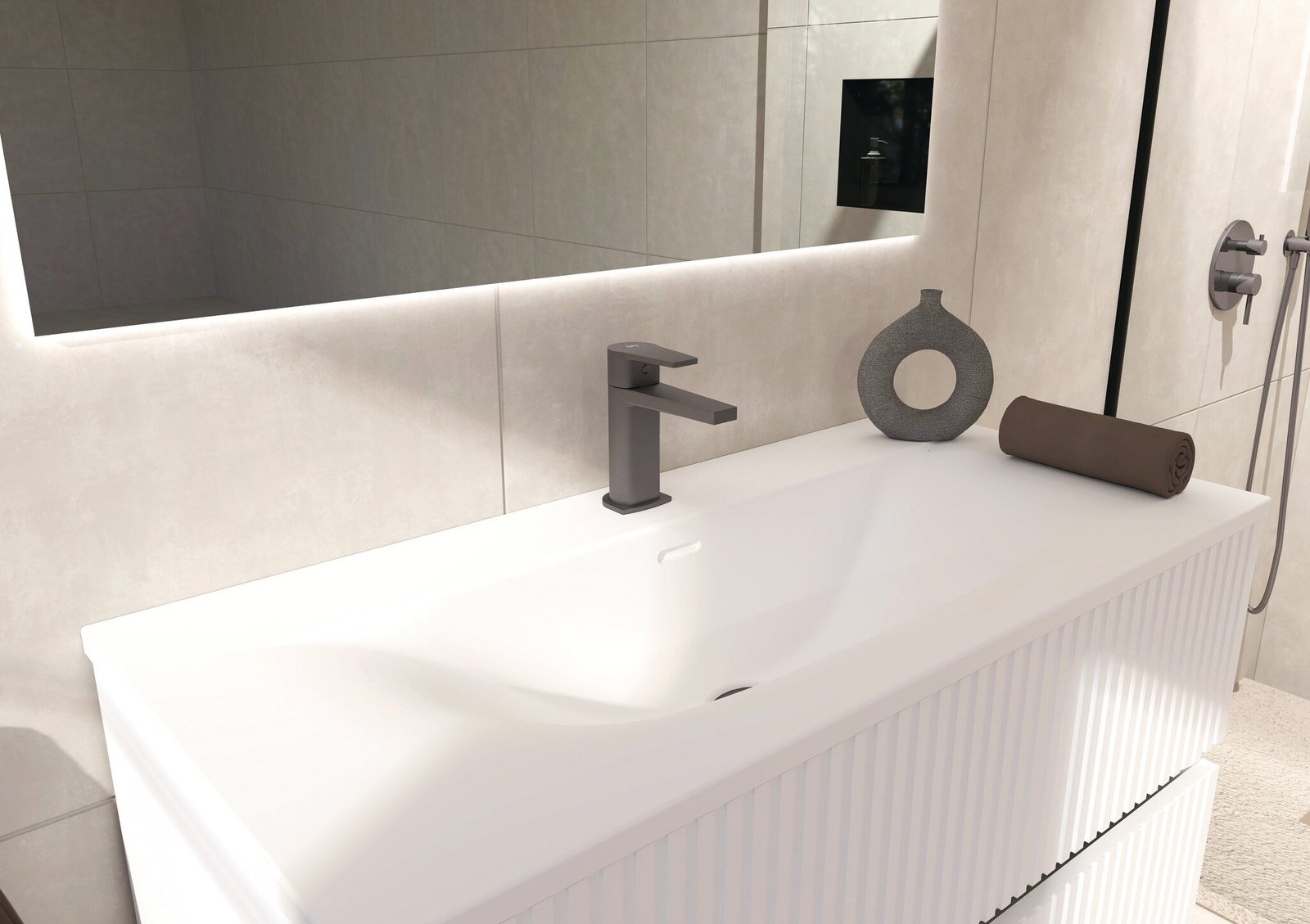 El acabado gunmetal aporta un aire moderno y sofisticado, ideal para combinar con lavabos en blanco mate, encimeras de piedra oscura o muebles en tonos naturales, creando un contraste elegante y contemporáneo.