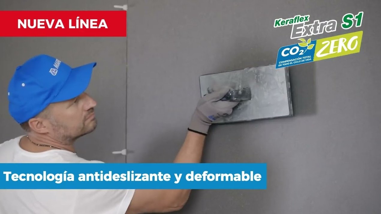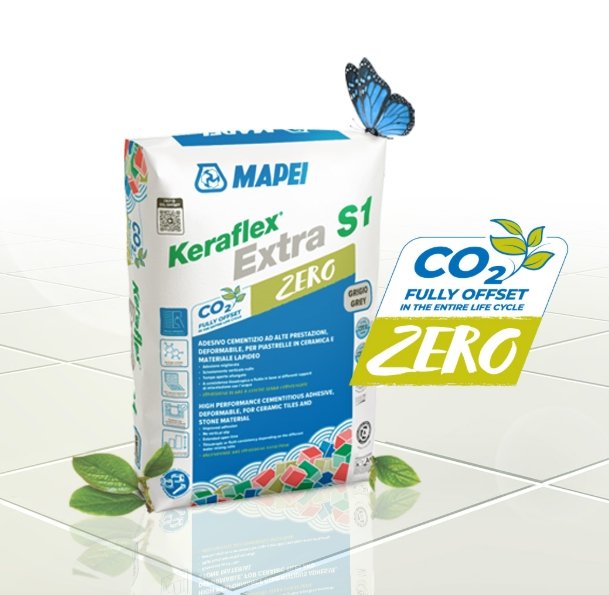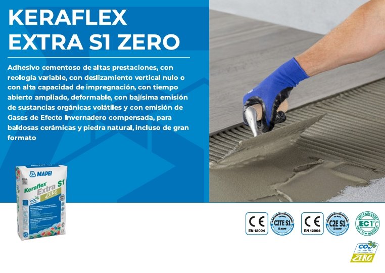 Adhesivo cementoso de altas prestaciones deformable de reología variable con deslizamiento vertical nulo o con alta capacidad de impregnación con tiempo abierto ampliado con bajísima emisión de sustancias orgánicas volátiles y con emisión de Gases con Efecto Invernadero compensada, para baldosas cerámicas y piedra natural incluso de gran formato.